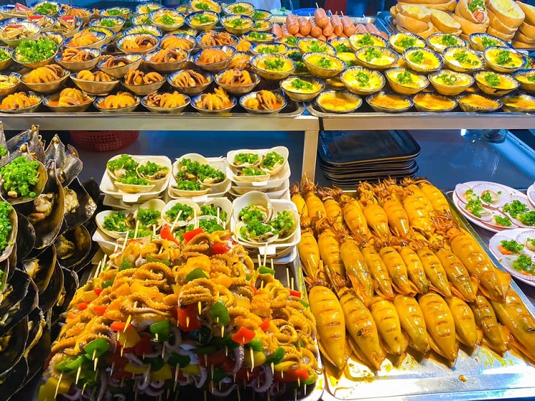 Hải sản tươi sống: Tôm, cua, ghẹ, sò huyết... được bày bán tại các quầy hàng và bạn có thể yêu cầu chế biến ngay tại chỗ.