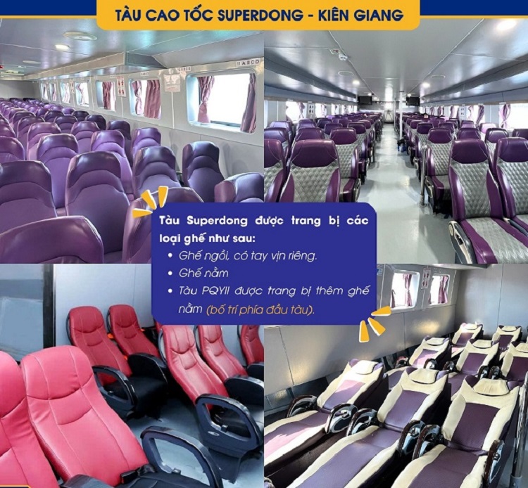 Tiện nghi nổi bật tàu Superdong: Điều hòa máy lạnh, ghế ngồi ngả lưng, nước uống miễn phí, áo phao, boong tàu rộng ngắm cảnh biển đảo... Đặc biệt tàu Superdong có thiết kế khả năng chống ồn, vận hành êm, giúp giảm cảm giác say sóng cho hành khách.